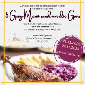 Am 12. Oktober 2024 laden wir Sie herzlich ins Hotel-Restaurant „Zum Schwanen“ ein, um die feinen Köstlichkeiten aus dem Bergischen Land zu genießen. Ab 18:00