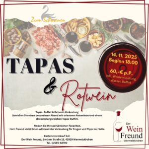 Am 14. November 2025 ab 18:00 Uhr laden wir Sie herzlich zu einem besonderen Abend im Zum Schwanen ein. Genießen Sie ein abwechslungsreiches Tapas-Buffet und